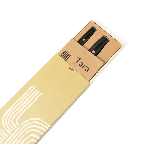 The Tara Chef’s set, made from stainless steel, offers both style and versatility. The chef's knife features a 21 cm blade, making it versatile for various kitchen tasks. The paring knife, with its short blade, is ideal for tasks that demand precision and finesse. Crafted from high-quality 5Cr15Mov stainless steel, these knives boast exceptional durability and performance. The beautiful pakkawood handle provides a comfortable and secure grip, while the superb balance in the blade ensures ease of use. Size chef's knife: 33 cm (blade 21 cm). Size paring knife: 19.5 cm (blade 8.5 cm). Hand wash only to ensure a long life.