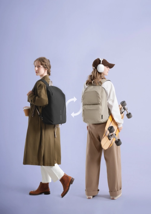Switch Backpack redefines versatility with the upgraded Shape-Shift Zipper System 2.0, allowing the bag to fully switch between two distinct styles in one. One side Minimalist, one-piece construction creates a clean, structured silhouette, while the other embraces a casual look, retro-inspired with multiple zipper pockets for easy access. It balances formal and everyday wear effortlessly. Crafted with lightweight recycled nylon, grid pattern nylon, while the lining is crafted with AWARE™, the use of genuine recycled fabric is guaranteed. 21% recycled content. Registered design®.